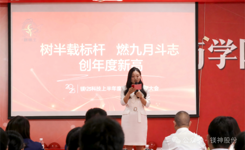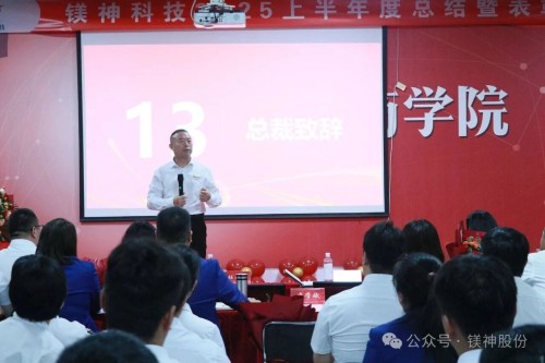 大会在全体镁神人“好!很好!非常好!镁神更好!”的响亮应答中开启,随后全体起立宣誓,共同唱响《镁神司歌》。上半年的成绩来之不易,离不开领导的正确引领,首先由总裁孙文先生为大家作2025年上半年度工作总结。孙总全面复盘了上半年公司的经营成果,既肯定了全体员工在业绩增长、产品创新等方面取得的优异成绩,也精准指出了工作中存在的不足与待改进的方向。“一群人、一条心、一件事、一辈子,干好干到极致”,孙总将目标与信念融入话语,为全体镁神人清晰勾勒出下半年的发展路径。台下掌声雷动,有如此清晰的战略指引,我们定能行稳致远。